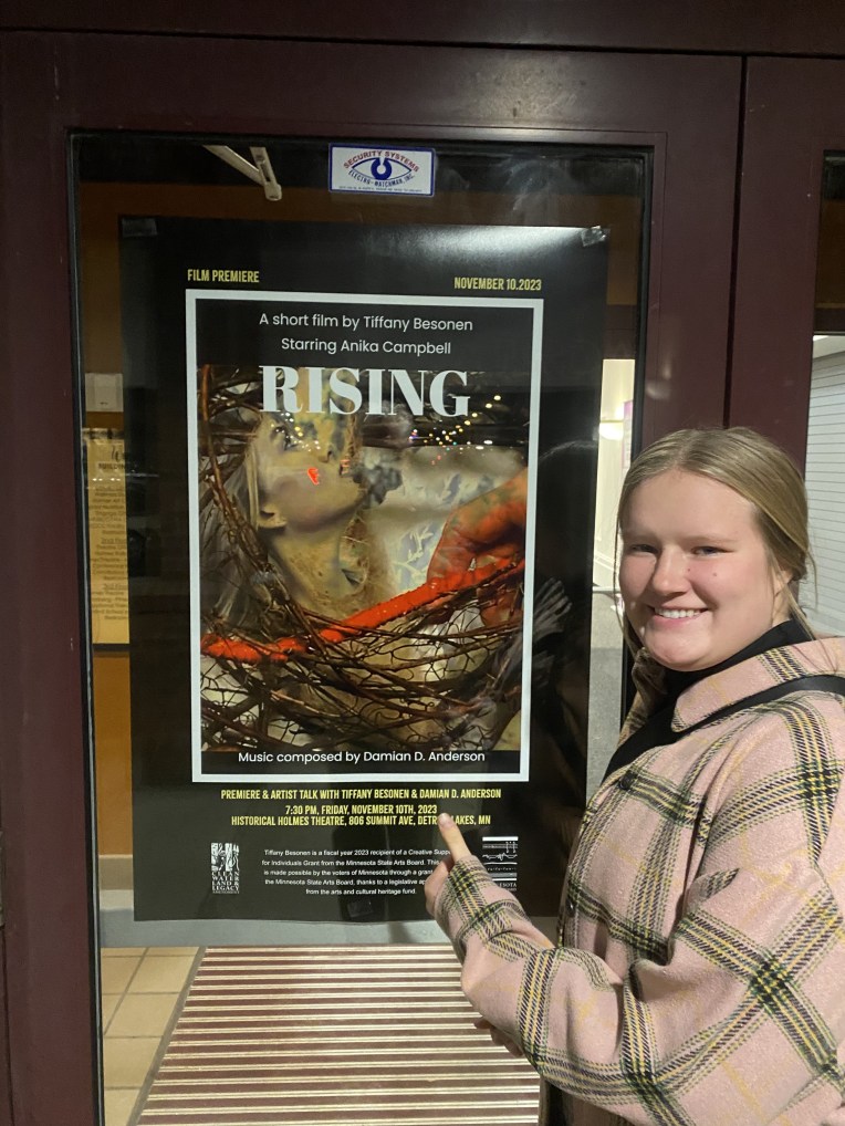 The premiere of the short experimental film RISING was November 10th, 2023 at the Holmes Theater in Detroit Lakes, Minnesota. After the film premiere, director/sculptor Tiffany Besonen and musician/composer Damian D. Anderson talked about the process of creating the short film and answered questions from the audience. Trailer for RISING.
