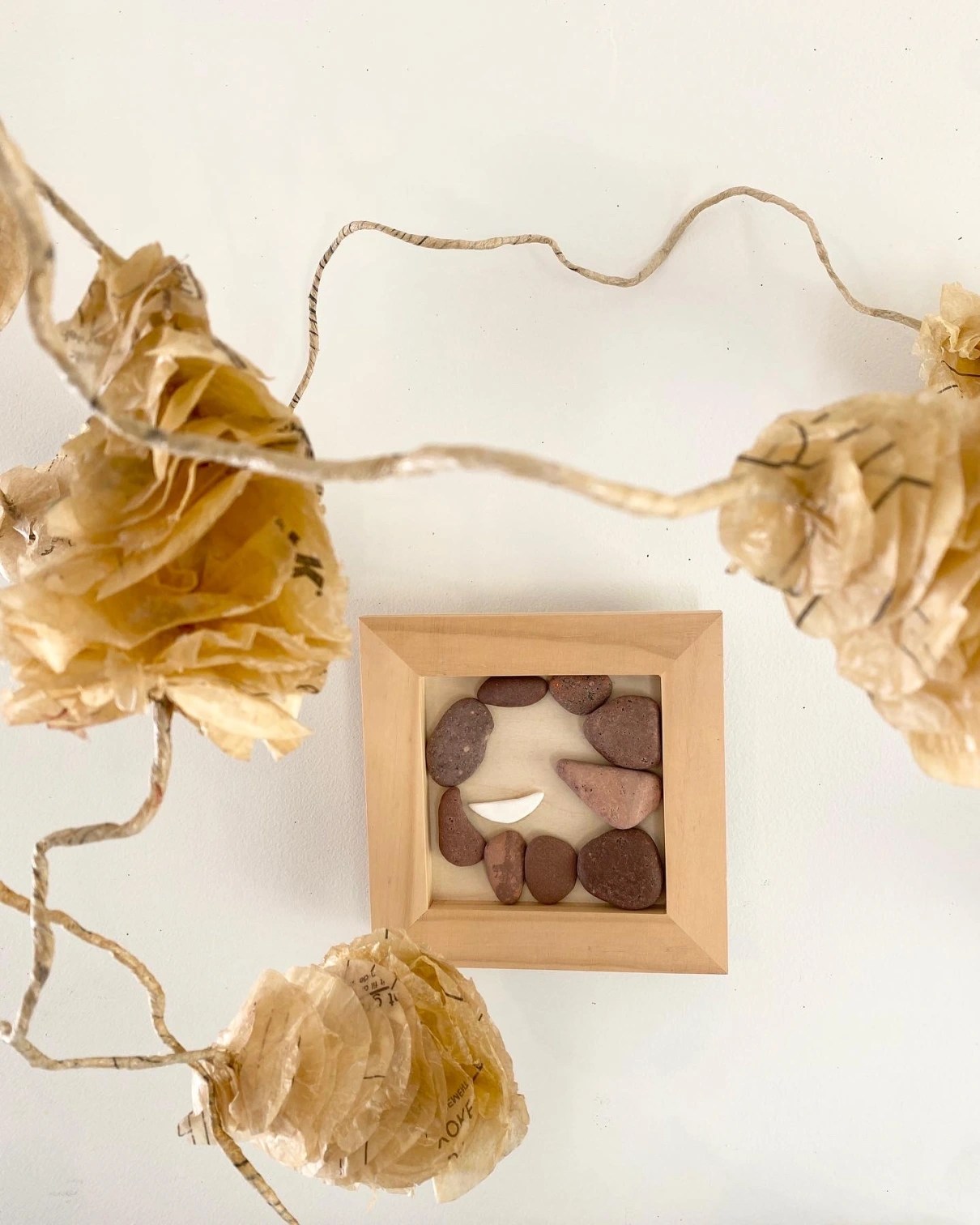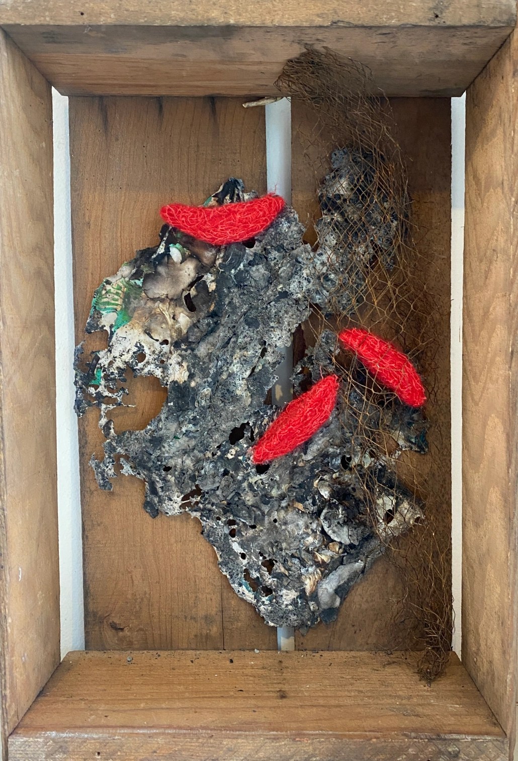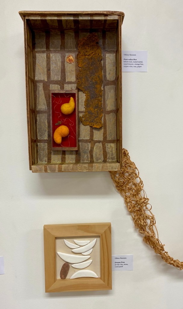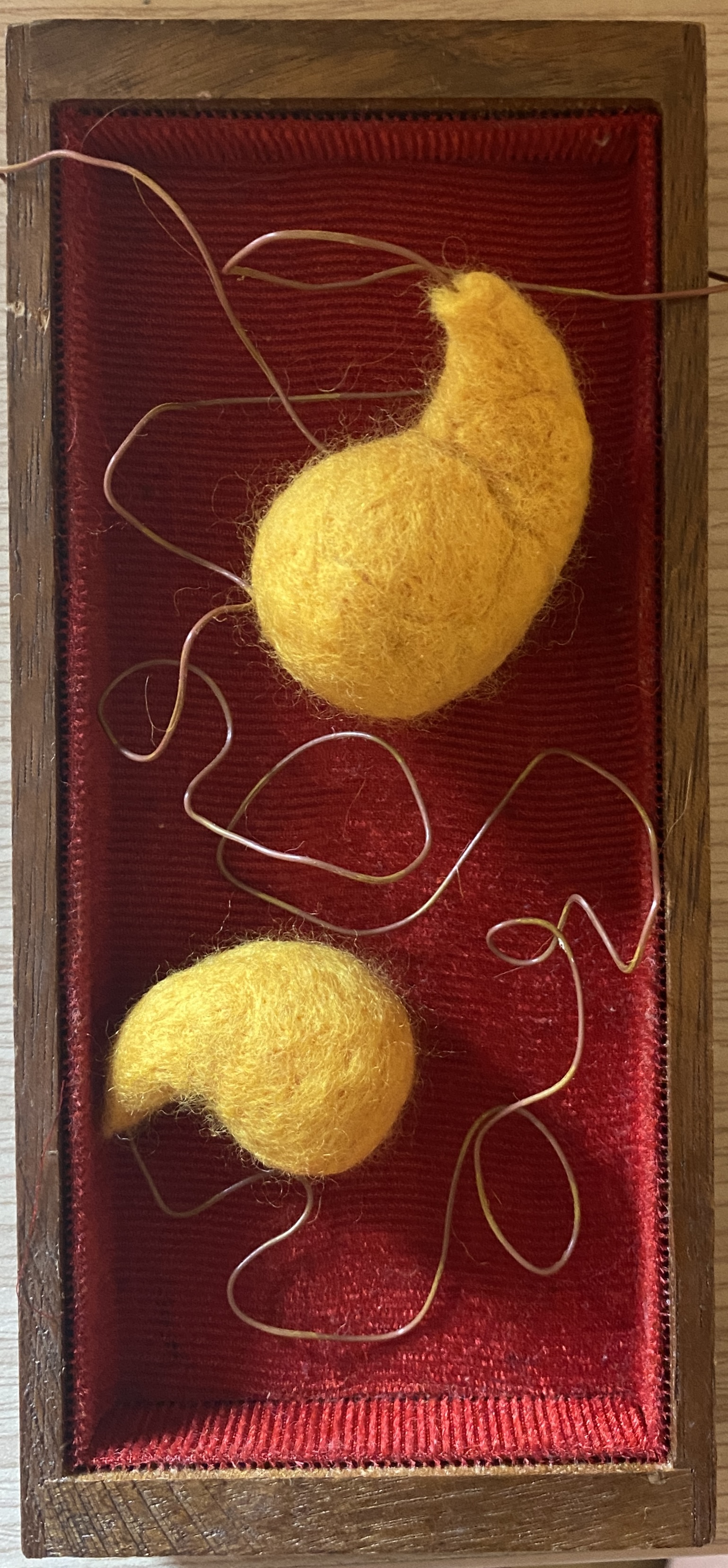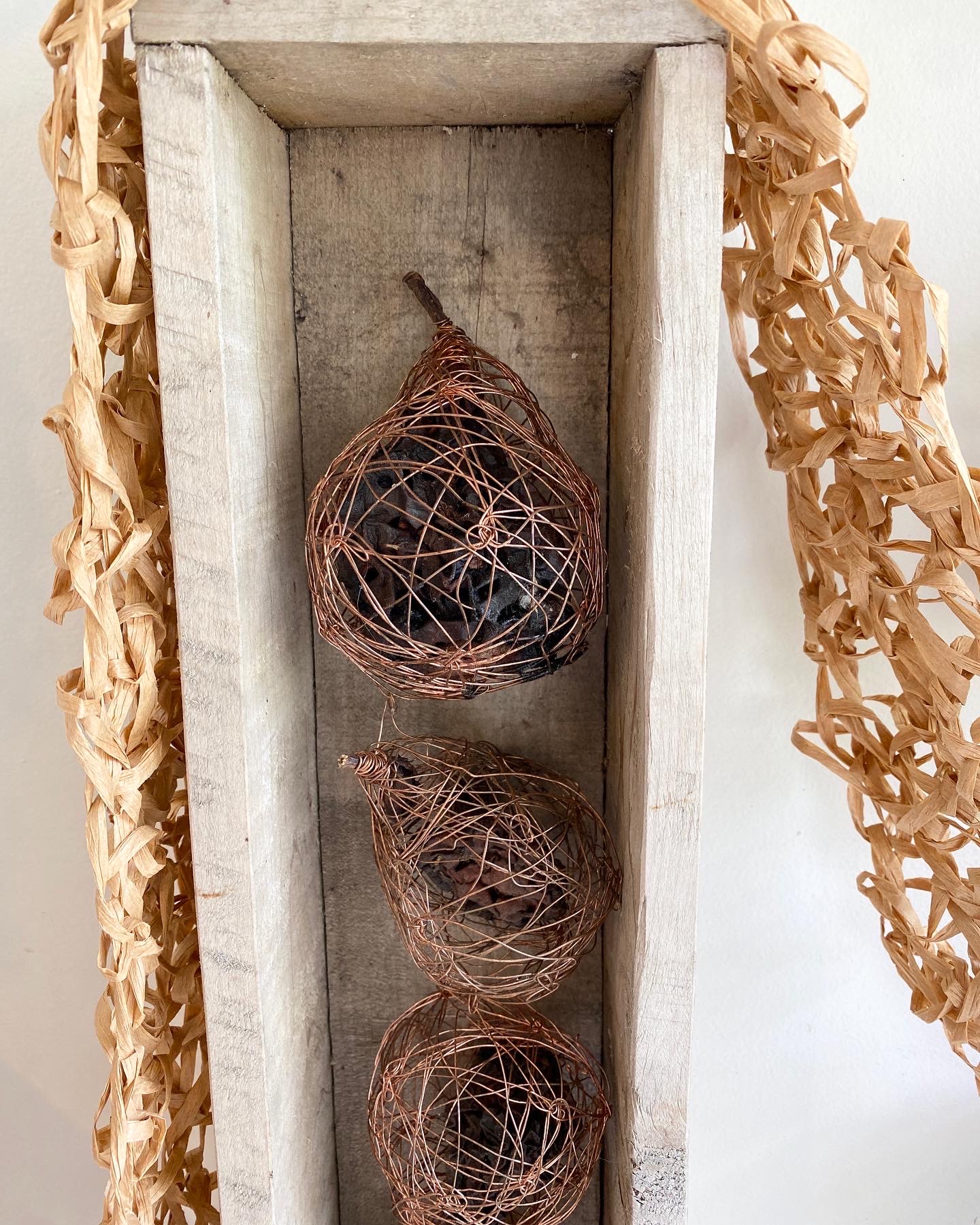 While repurposing and environmental concerns have been the focus of recent work, I am also circling back to some past themes about parenthood, aging, and ideas about pride and humility. Last summer at workshops in Boston after creating the small Pear-a-dox felted wool and wire sculpture, I wrote the following, “Pears started in my work when expecting my first child. Now both ‘children’ are in college and yet the intense connection remains tethered to my heart and gut. The process of creating these two- and three-dimensional works was a process of self-discovery. Who am I now? What forms with wool, wire, and a vintage box? What happens when the boxed forms are photographed, digitally altered, printed large, and drawn and painted upon? As I disconnect from distractions and the past, I connect to the present to form, reform, and form myself again.“